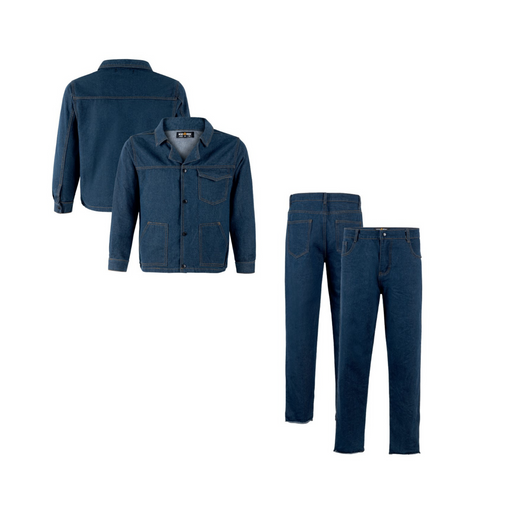 COMPOSICIÓN: Mezclilla 100% Algodón, 12,5 oz. Pantalón de mezclilla corte recto, 5 bolsillos y botón plástico.Chaqueta de mezclilla con bolsillo ...